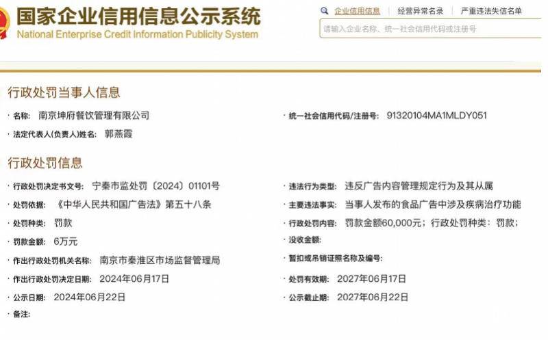2025年5月,上海市市场监督管理局网站显示,上海和府餐饮管理有限公司,因发布广告使用国家级、最高级、最佳等用语,违反广告法,被上海市浦东新区市场监督管理局罚款3万元。